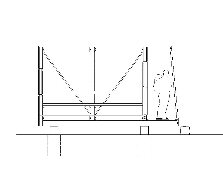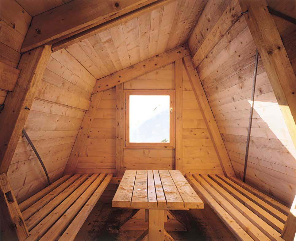 Kapaciteta enoprostorske notranjosti je 4-8 oseb, prostor je fleksibilno uporaben kot spalni ali bivalni prostor. Zgornja ležišča so sklopna, miza in naslonjala klopi odmična. Oprema bivaka je osnovna in prilagojena standardu začasnega zavetišča. Zavetna terasa pod napuščem na vhodni strani služi kot mala vstopna ploščad za zunanje bivanje. Celoten bivak je izveden v lesu in pokrit s pločevinasto Alu kritino v pasovih. Lesena skeletna konstrukcija je zaradi vlage dvignjena na točkovne betonske temelje. Bivak je bil izveden z montažno predizdelavo v tesarski delavnici. Konstrukcija z opažem vred je bila prvotno izdelana v Cerknem in naknadno razstavljena ter prepeljana v vas Breginj, pod lokacijo bivaka. Od tam je bil organiziran helikopterski prevoz v 6 tovorih, ki niso smeli presegati nosilnosti 900 kg. Bivak je bil na lokaciji v treh dneh sestavljen in dokončan.